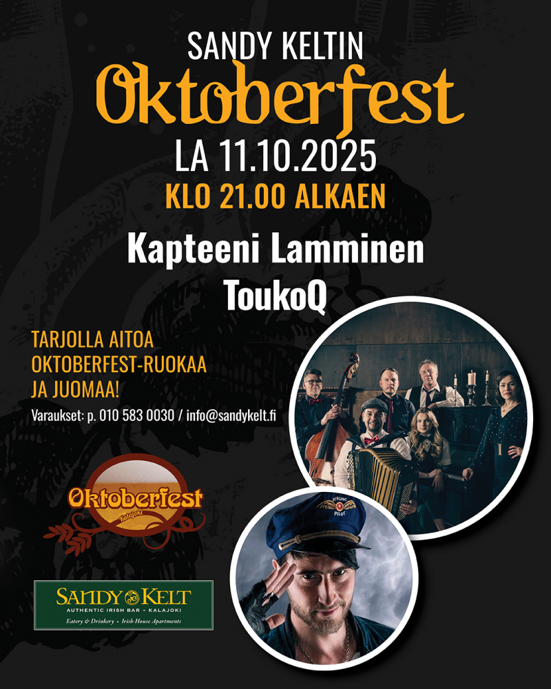 Sandy Keltin Oktoberfest tulee taas ja pistää vipinää lederhoseneihin! Illan alkuvauhdit antaa Remix-yhtyeen keulasta tuttu Kapteeni Lamminen ja varsinaiset tanssit pistetään pystyyn debyyttikeikkansa Keltissä vetävän ToukoQ:n kanssa. Tarjolla myös pretzeleitä, bratwurstia ja muita perinteisiä makuja sisältävä Fest-annos sekä tietenkin oktoberfest-olutta! Fest-ohjelma: 21-23 Kapteeni Lamminen 23-1.30 ToukoQ Oompappaa! |